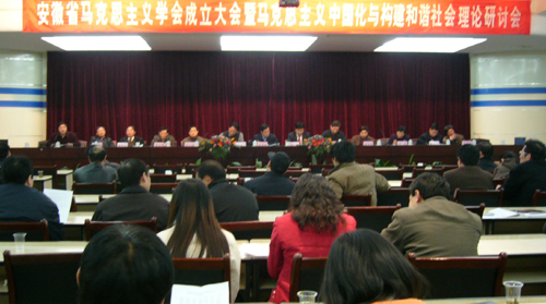 12月30日上午,安徽省马克思主义学会成立大会暨马克思主义中国化与和谐社会构建理论研讨会在合肥市顺利开幕。中共安徽省委宣传部理论处处长计永超、安徽省社科联副主席祁家云、安徽省委教育工委副书记张荣国、安徽省哲学学会会长谢道文、安徽医科大学副书记江敏到会致辞。安徽省民政厅王泽华局长宣读了学会批文,学会筹备组副组长、安徽农业大学人文社会科学学院院长黄邦汉教授向与会人员介绍了学会的筹备情况。来自安徽省委党校、省社会科学院、省社会科学界联合会、省委讲师团、合肥市委党校以及部分高等院校的专家、学者100多人参加了此次盛会。