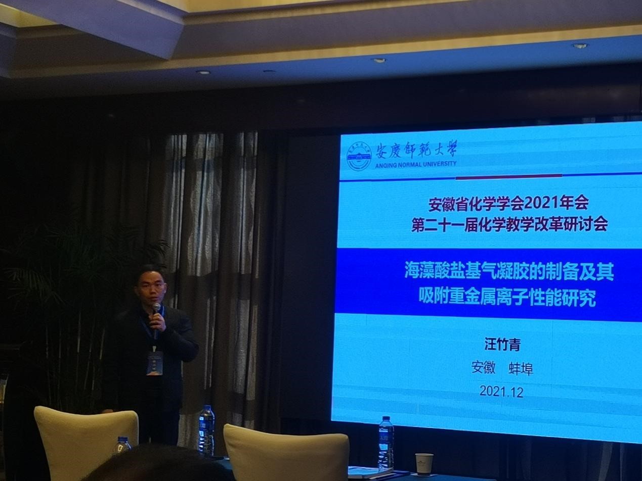 12月4日,安徽省化学学会2021年年会暨第二十一届化学教学改革研讨会在蚌埠南山豪生大酒店召开,永利官网化学化工学院教师代表一行9人参会,汪竹青教授受邀作题为《海藻酸盐气凝胶的制备及其吸附重金属离子性能的研究》主题报告。