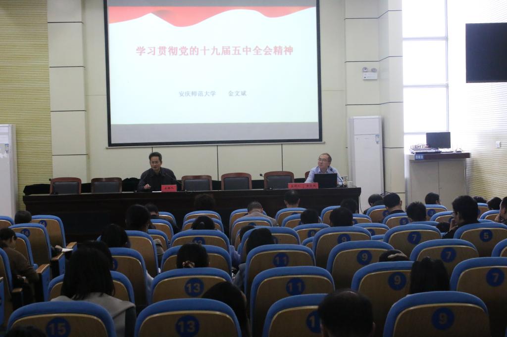 11月18日中午,安庆医药高等专科学校党委在图书馆学术报告厅举行11月份第二次理论学习中心组(扩大)学习会议,邀请永利yl23411no1马克思主义学院金文斌教授作“十九届五中全会精神”专题辅导讲座。安庆医药高等专科学校校领导、校本部副科级以上干部、处长(主任)助理、系部秘书、兼职思政课教师、专兼职辅导员,附院领导班子成员参加会议。安庆医药高等专科学校纪委书记陈燚主持学习会。