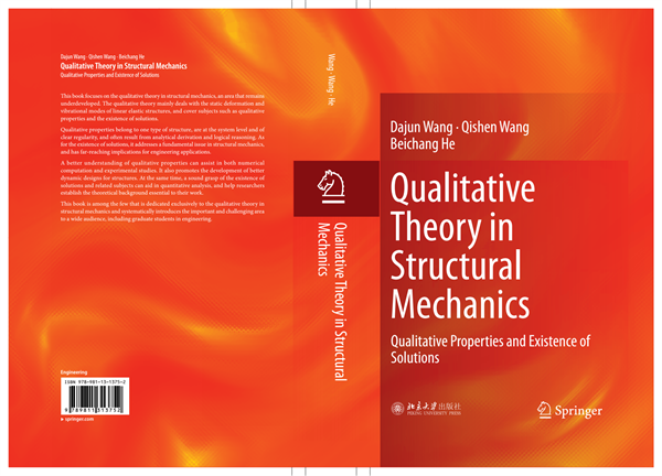 近日,由北京大学王大钧教授领衔,永利官网物理与电气工程学院王其申教授参著,美国通用电气公司何北昌高工主译的英文专著《Qualitative Theory in Structural Mechanics》已由Springer出版社和北京大学出版社联合正式出版。这次出版的英文版,是本书三位作者在2014年北京大学出版社出版的中外物理学精品书系之一的《结构力学中的定性理论》一书基础上,精心修改的产物。新书采用严格的数学推理和结构力学的基本概念相融合的方法,论述了线弹性结构力学中三个领域内的定性理论,内容包括:⑴一维典型结构弦、杆和梁的离散和连续系统的固有频率和模态的定性性质;⑵重复性结构的离散和连续系统的固有频率和模态的定性性质;⑶弹性结构振动的普遍性质。全书共八章,王其申教授起草了其中的第二至第六章。该书的出版在结构力学中的定性理论研究领域为国内外有关同行提供了一本具有理论意义和实用价值的学术参考资料。