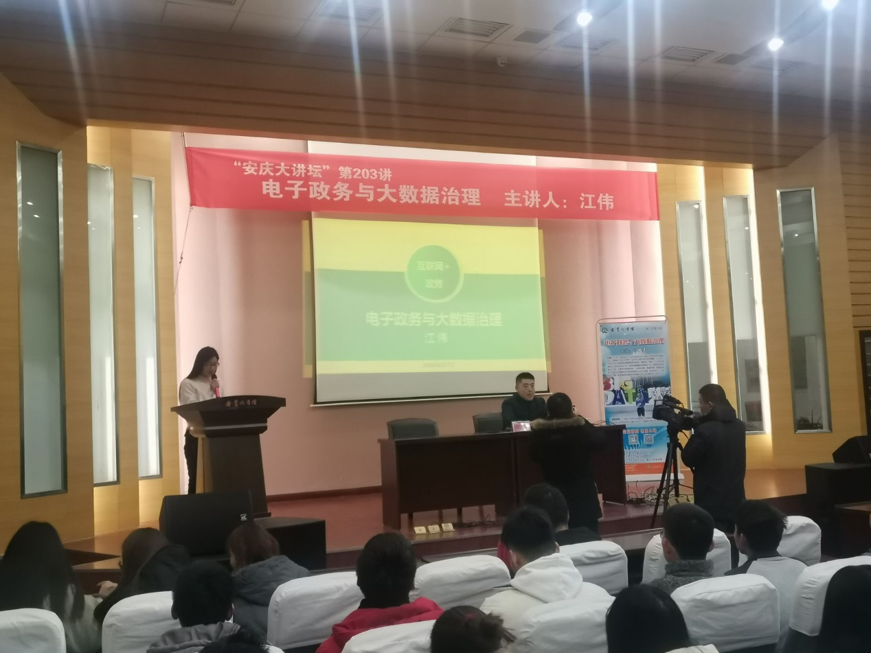 安庆市计算机学会常务理事,计算机学院副教授、硕士生导师江伟老师应邀主讲《电子政务与大数据治理》,报告讲授了我国电子政务的发展情况与国家政策,安庆市互联网+电子政务的现状与建设目标,以及大数据治理在电子政务建设发展中的重要作用。永利官网大学生和安庆市民近80人聆听了讲座。