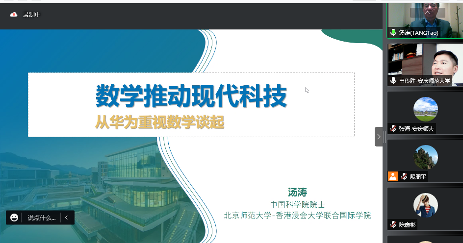 为庆祝永利yl23411no1办学125周年,提高师生的科研创新能力,进一步营造良好的学术风气和浓厚的学术氛围,激发师生的科研活力,5月27日上午,应科研处和数理学院邀请,中国科学院院士、北京师范大学-香港浸会大学联合国际学院校长汤涛教授为师生作了一场题为“数学推动现代科技—从华为重视数学谈起”的线上学术报告。数理学院部分教师、硕士研究生和高年级本科生参加了报告会。报告会由数理学院院长申传胜教授主持。
