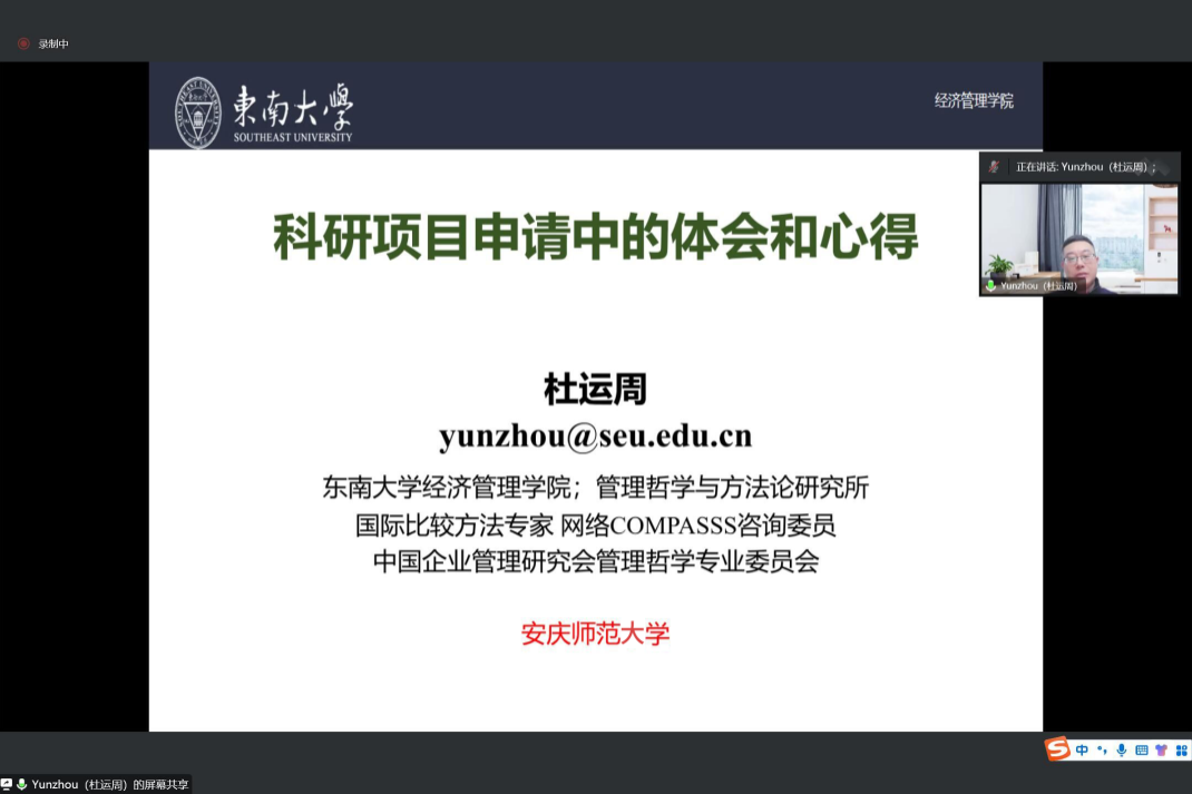 12月6日,东南大学经济管理学院杜运周教授为经济管理学院师生在线分享题为“科研项目申请中的体会和心得”的学术报告,报告会由经济与管理学院副院长徐俊杰主持,学院部分教师与研究生共60余人参加会议。