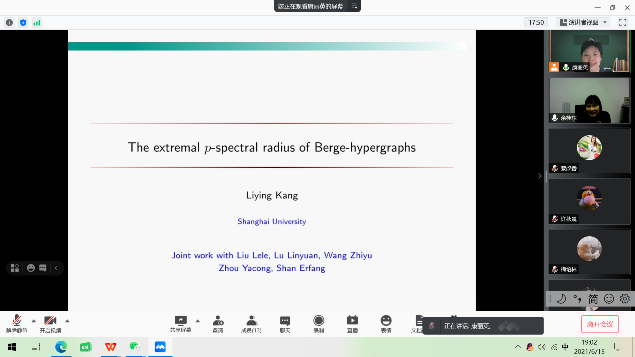 6月15日晚上,上海大学数学系康丽英教授应数理学院邀请作了一场题为“The extremalp-spectral radius of Berge-hypergraphs”的线上学术报告。数理学院兼职教授余桂东、数学一级学科硕士点部分导师和研究生同学参加了本次报告会,报告会由余桂东教授主持。